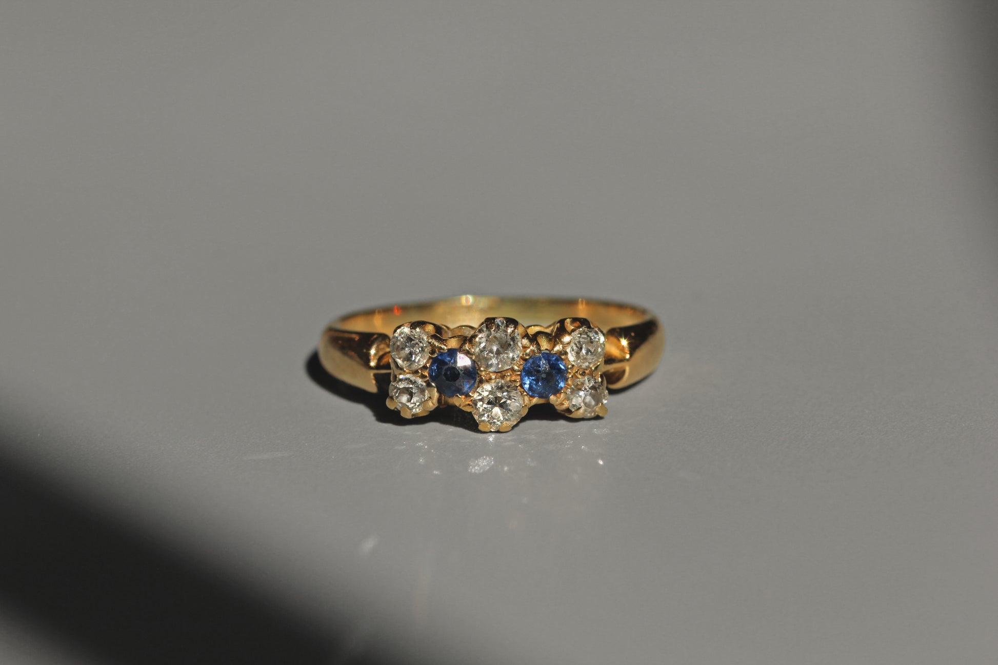 This stunning art deco piece hosts six sparkling old cut diamonds and two royal blue sapphires. Gorgeous silhouette, almost butterfly-like, the gallery of this ring has a generous height to it. The 18 carat gold shank is smooth and buttery, tapering out toward the shoulders and then in to two slender, angular arms that prop up the face of the ring - giving a wonderful cut-out effect.