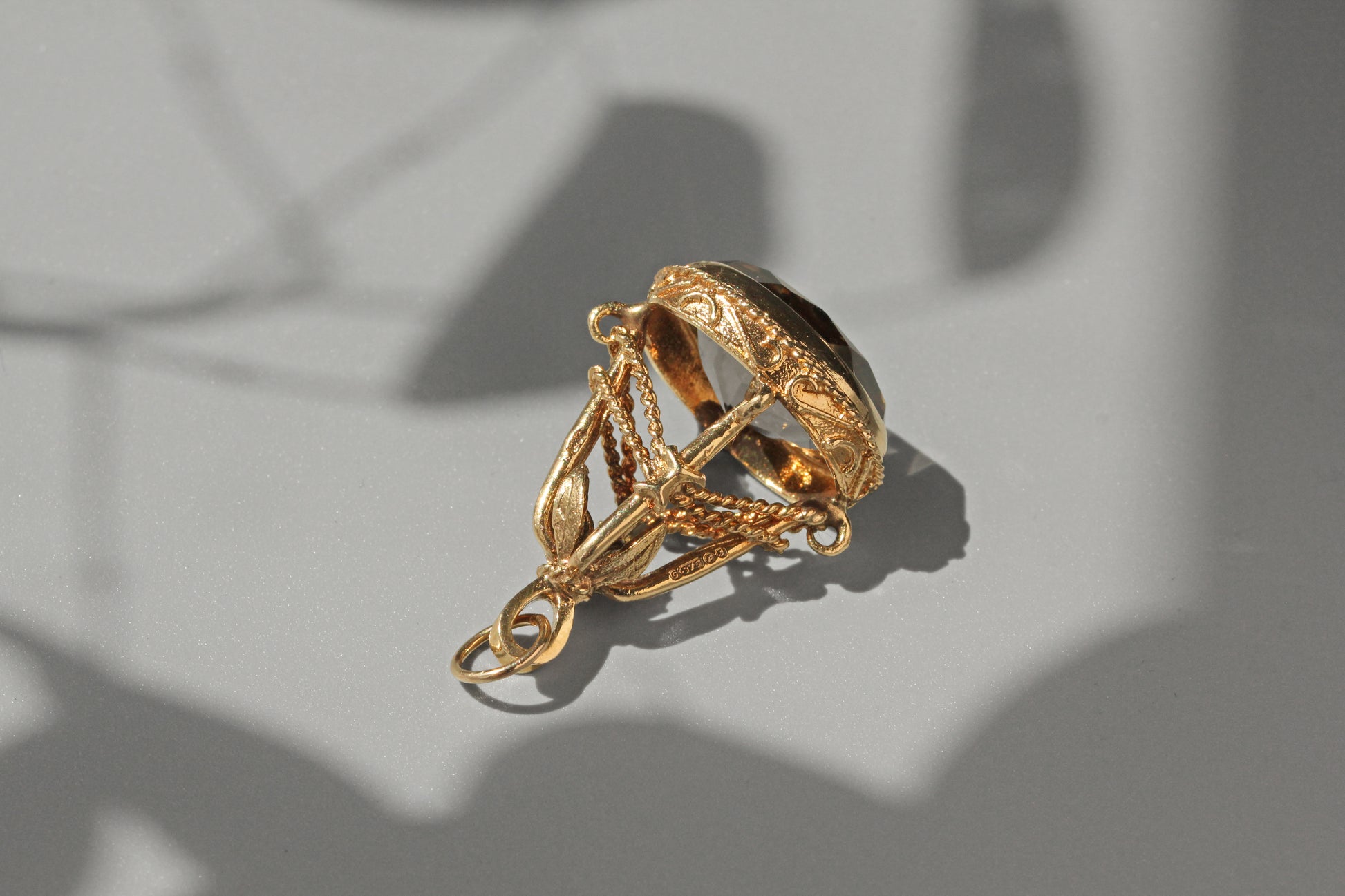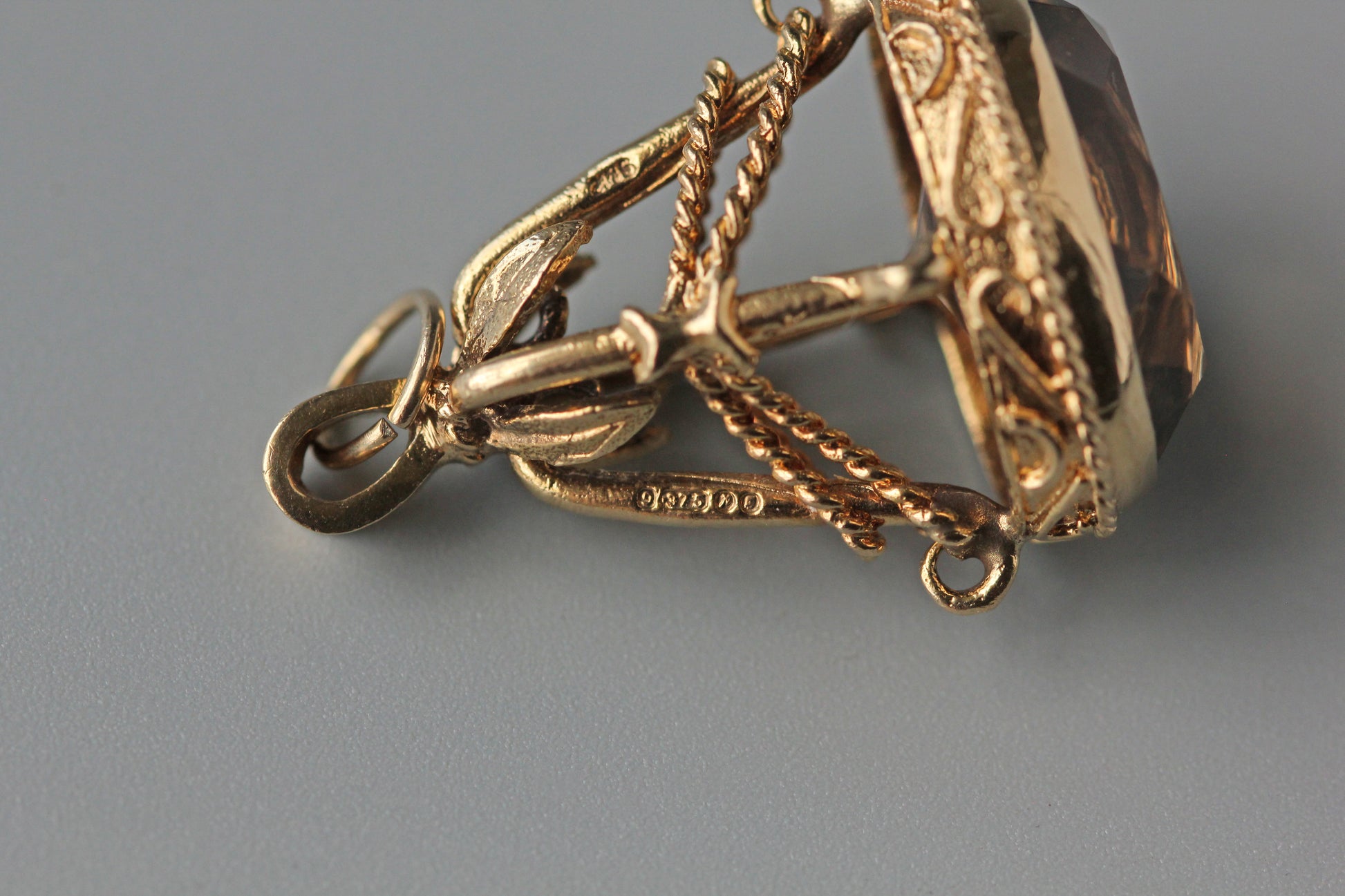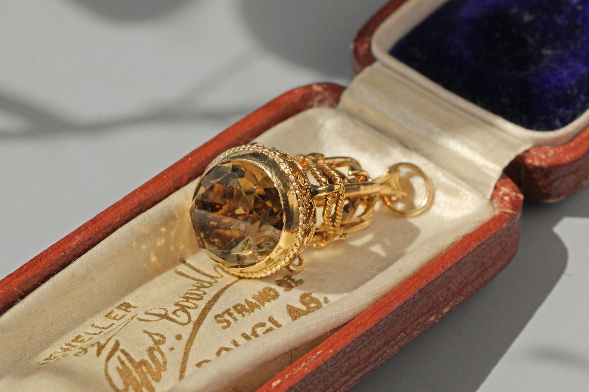 This gorgeous fob seal hosts a wonderful oval cut smoky quartz with fabulous facets which catch the light perfectly. The frame of this piece is elaborately crafted, with stunning twisted rope details and foliate leaves, which give this piece a form reminiscent of a Hollywood regency pineapple.