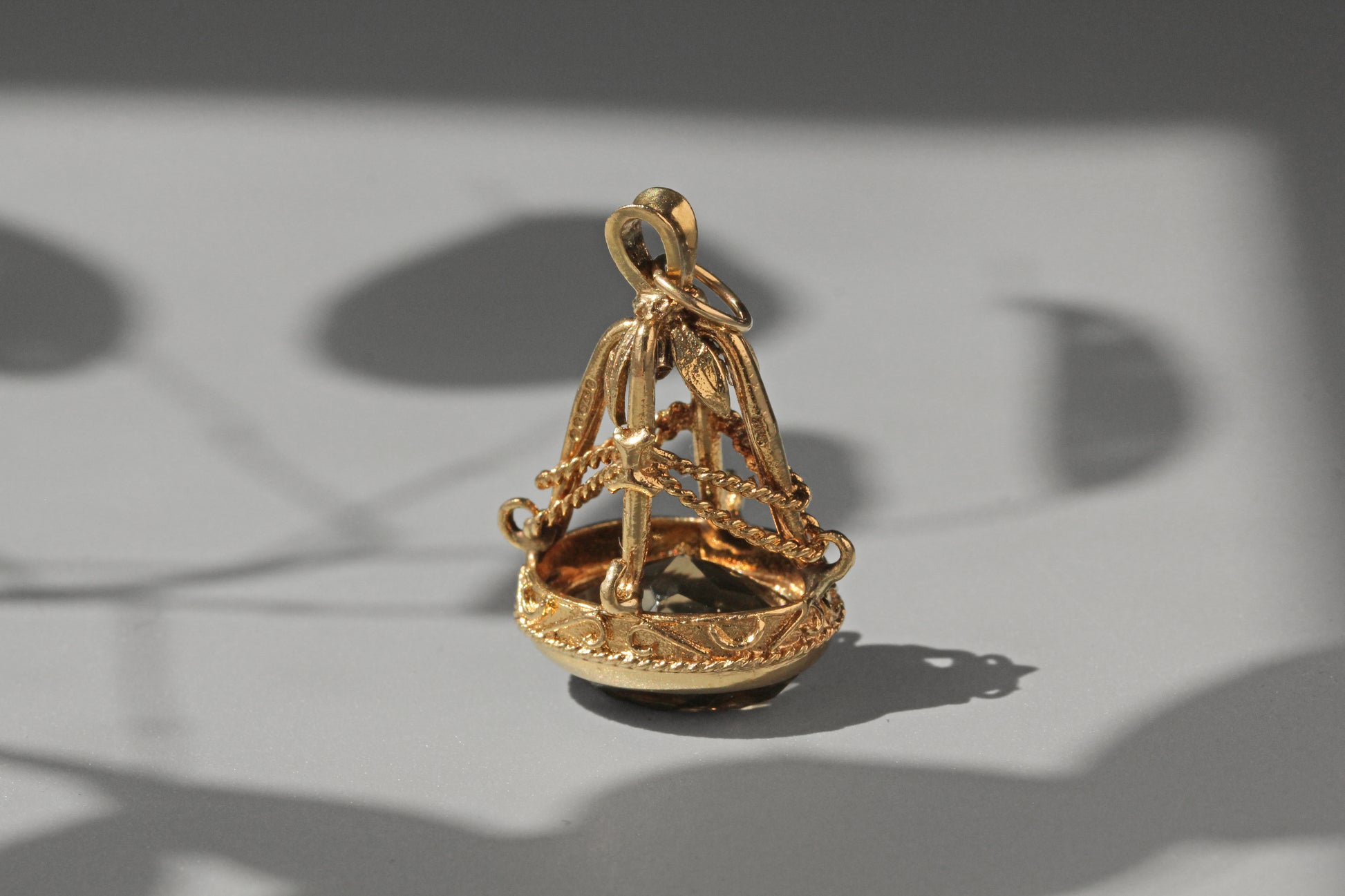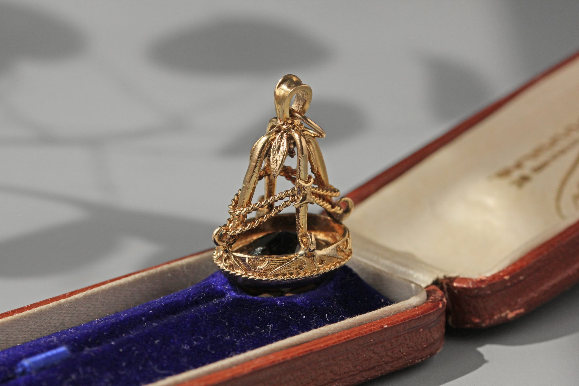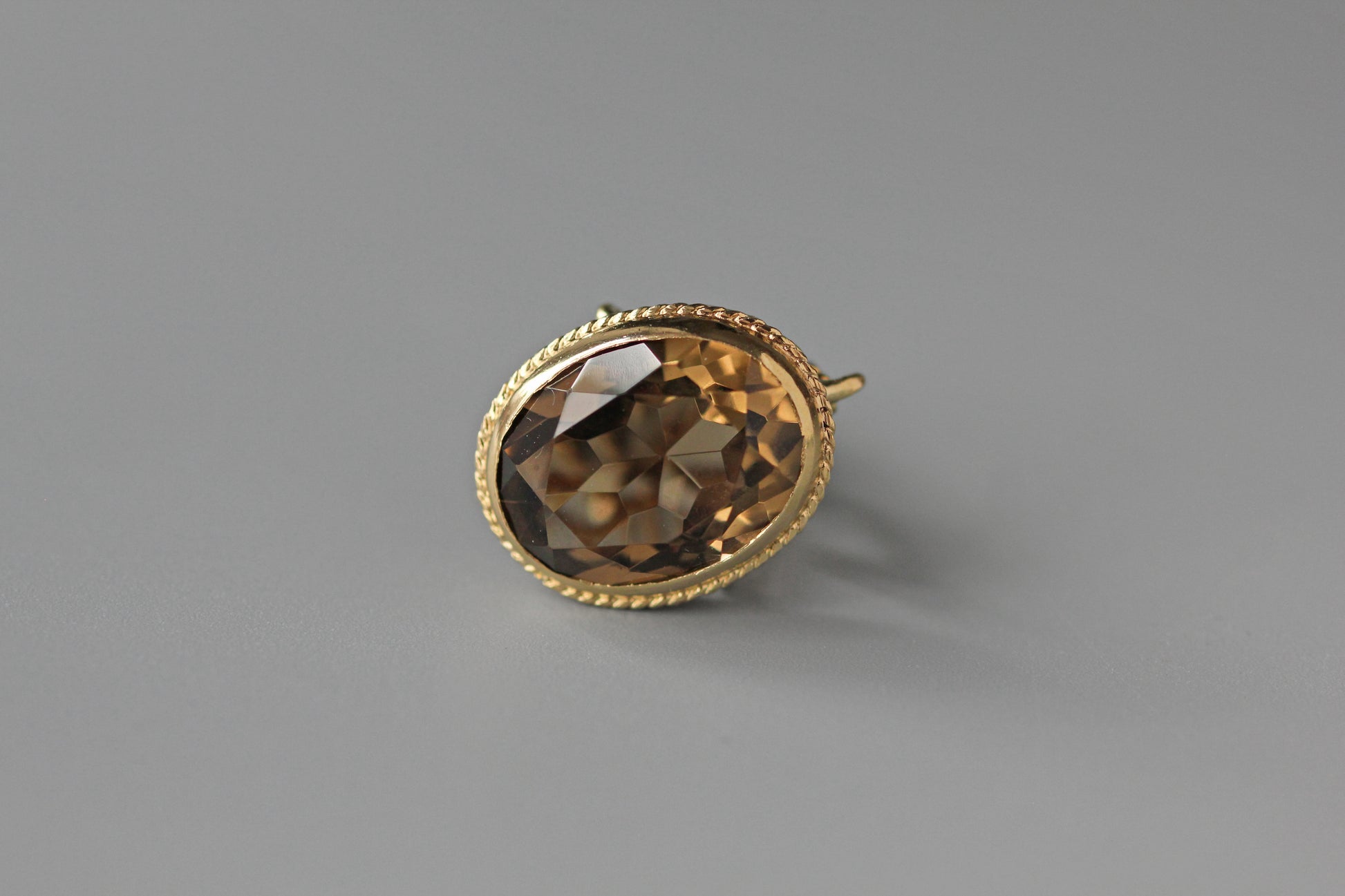 This gorgeous fob seal hosts a wonderful oval cut smoky quartz with fabulous facets which catch the light perfectly. The frame of this piece is elaborately crafted, with stunning twisted rope details and foliate leaves, which give this piece a form reminiscent of a Hollywood regency pineapple.