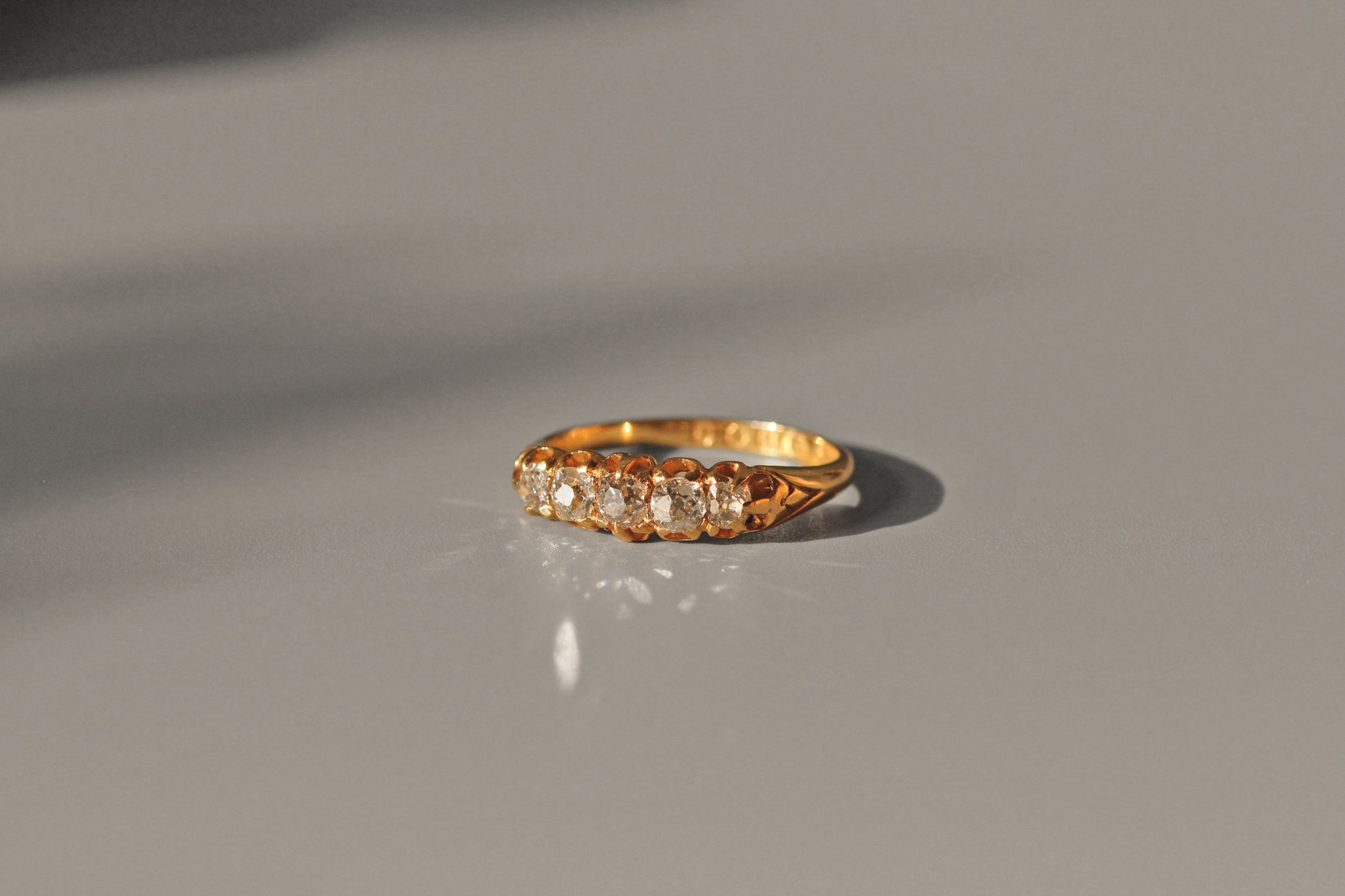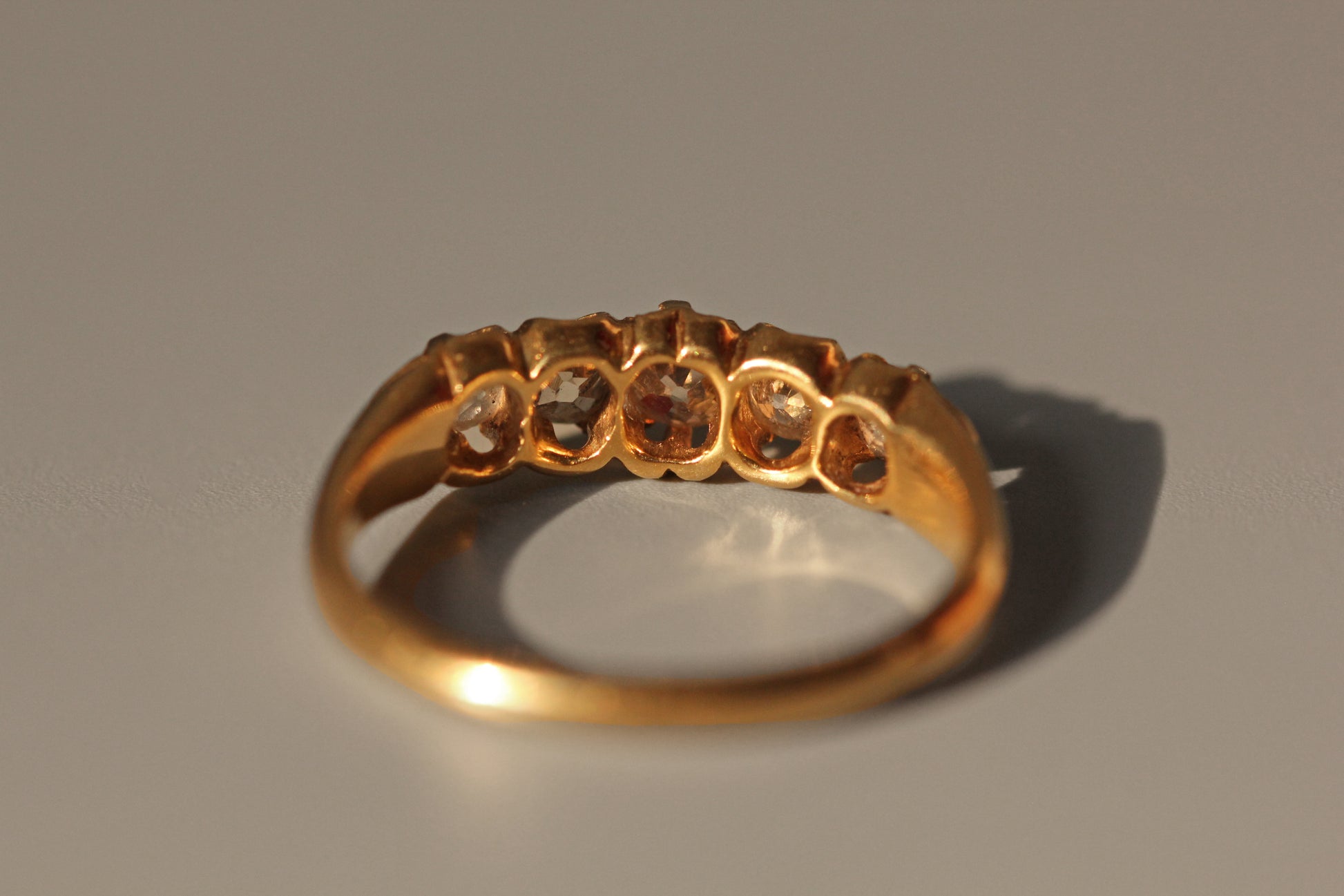 An absolutely stunning heirloom piece crisply hallmarked 1805, decorated with five *gorgeous*, lively, sparkling old cut diamonds, unbelievably in almost untouched condition considering its age. Striking hues of bright and buttery high carat gold throughout the shank/band, leading up to chunky, detailed shoulders which prop up the open gallery impressively. The diamonds are each set in a prong or claw setting, five of them sitting pretty upon the face of the ring.