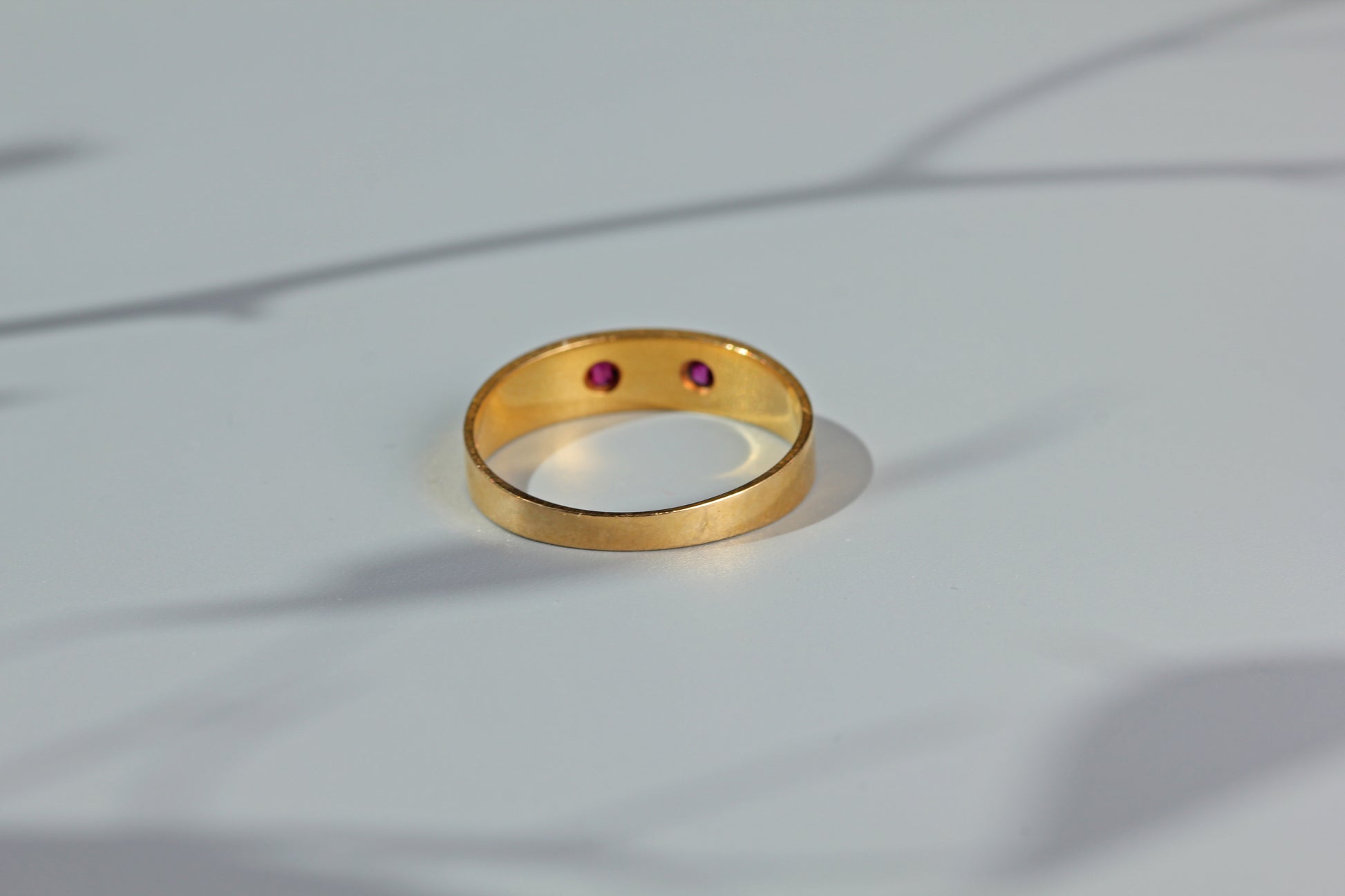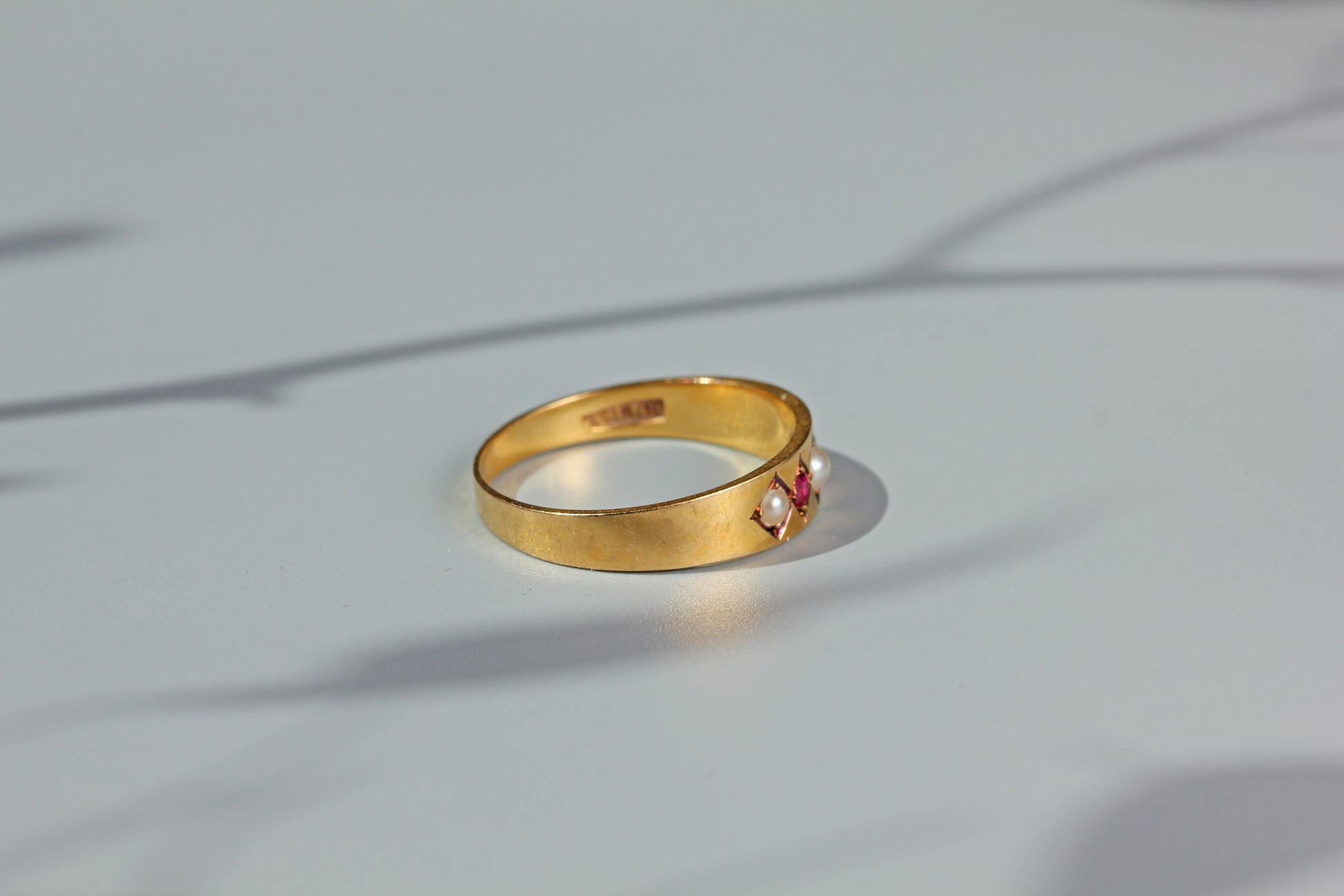 A gorgeous antique ruby and pearl band ring, set in buttery 18 carat gold and dating to the late Victorian era.