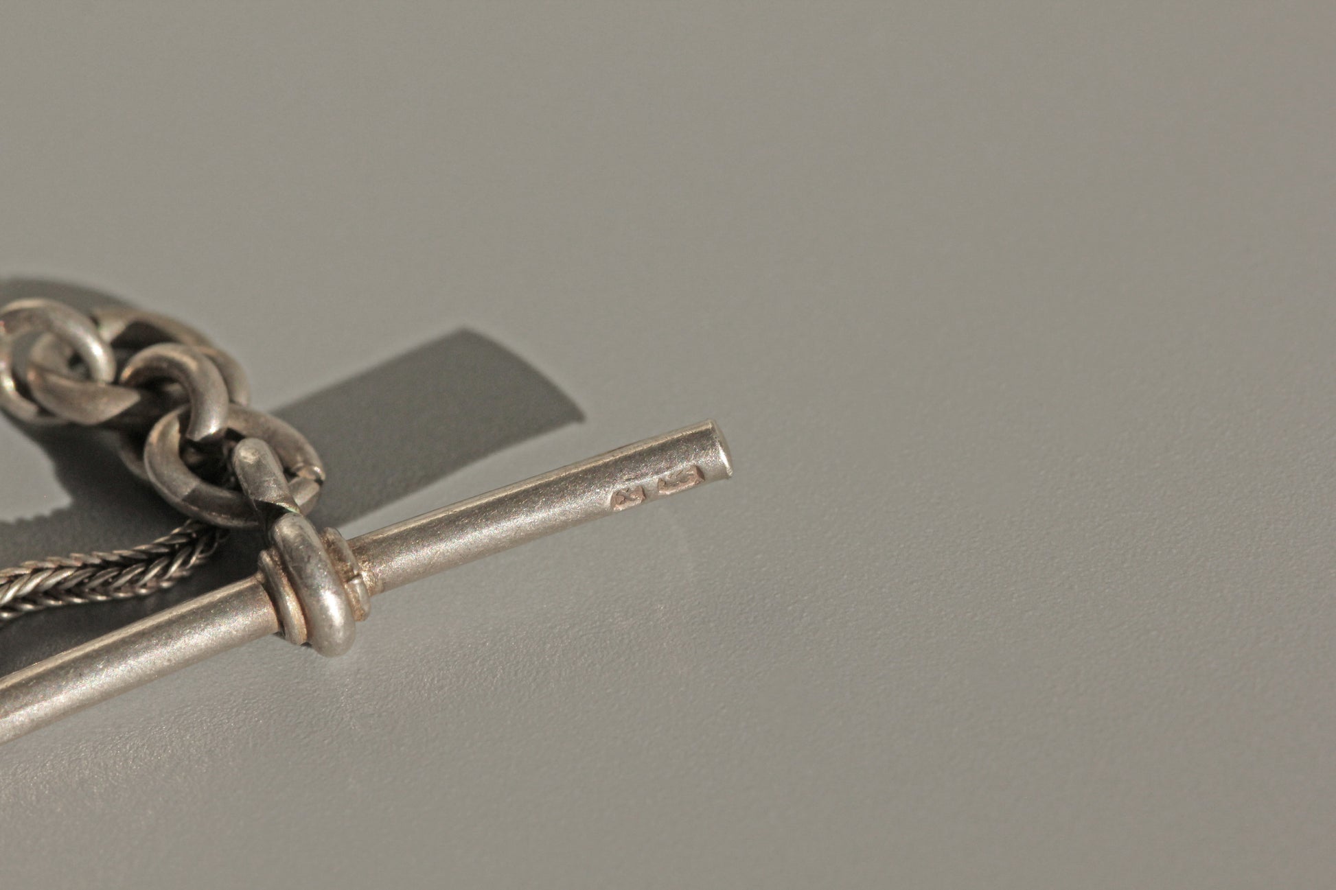 The chain is formed in a foxtail link, known for its fluid movement and subtle texture, and is finished with two sliders that add both interest and functionality. One end is fitted with a traditional dog clip, while the other features a t bar, both hallmarked and wonderfully preserved.