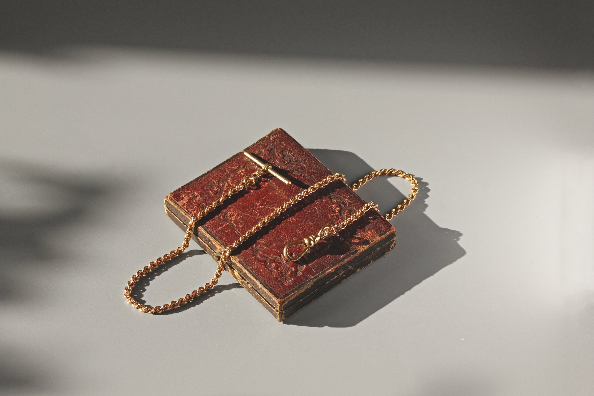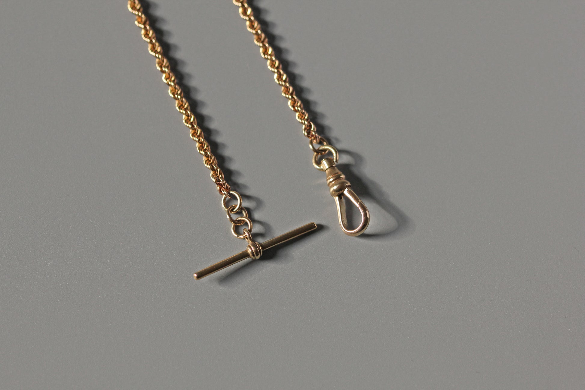 The chain is finished off with the classic combination of dog clip and a T-bar, quite slender in their look. The dog clip is in secure, working condition and is marked 9CT.