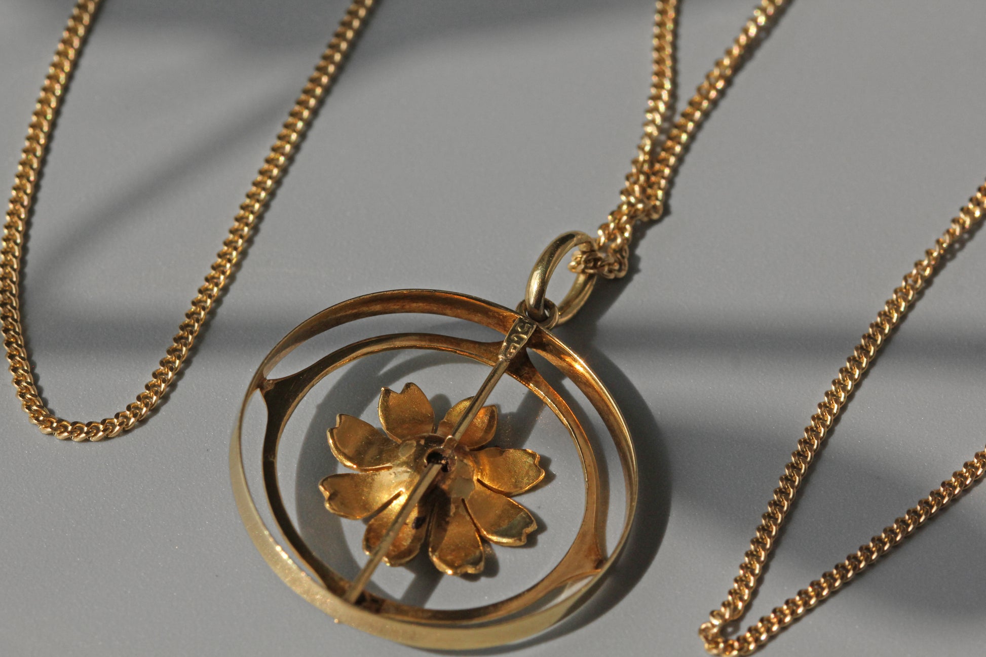 Antique victorian cosmos flower ruby pendant necklace, in 15 carat gold