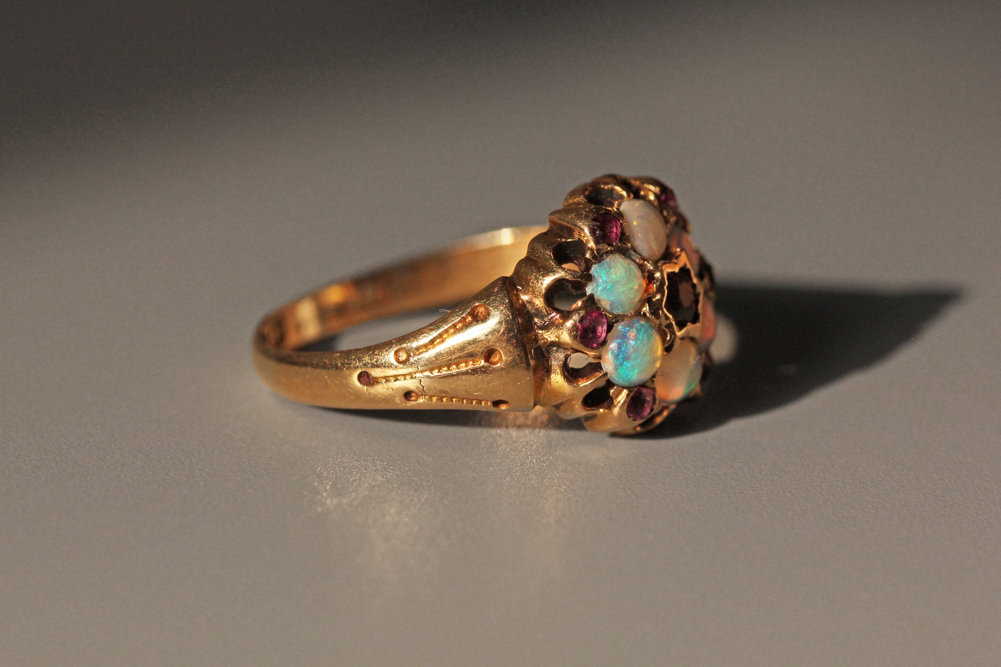 Here we have a super ethereal, mystifying, celestial Victorian piece. Crafted in high carat gold throughout, perfectly complementing the gemstone adorned face of the ring. A lovely floral openwork to the gallery and face, hugging six magical opals, a central amethyst and six further teeny tiny amethysts.