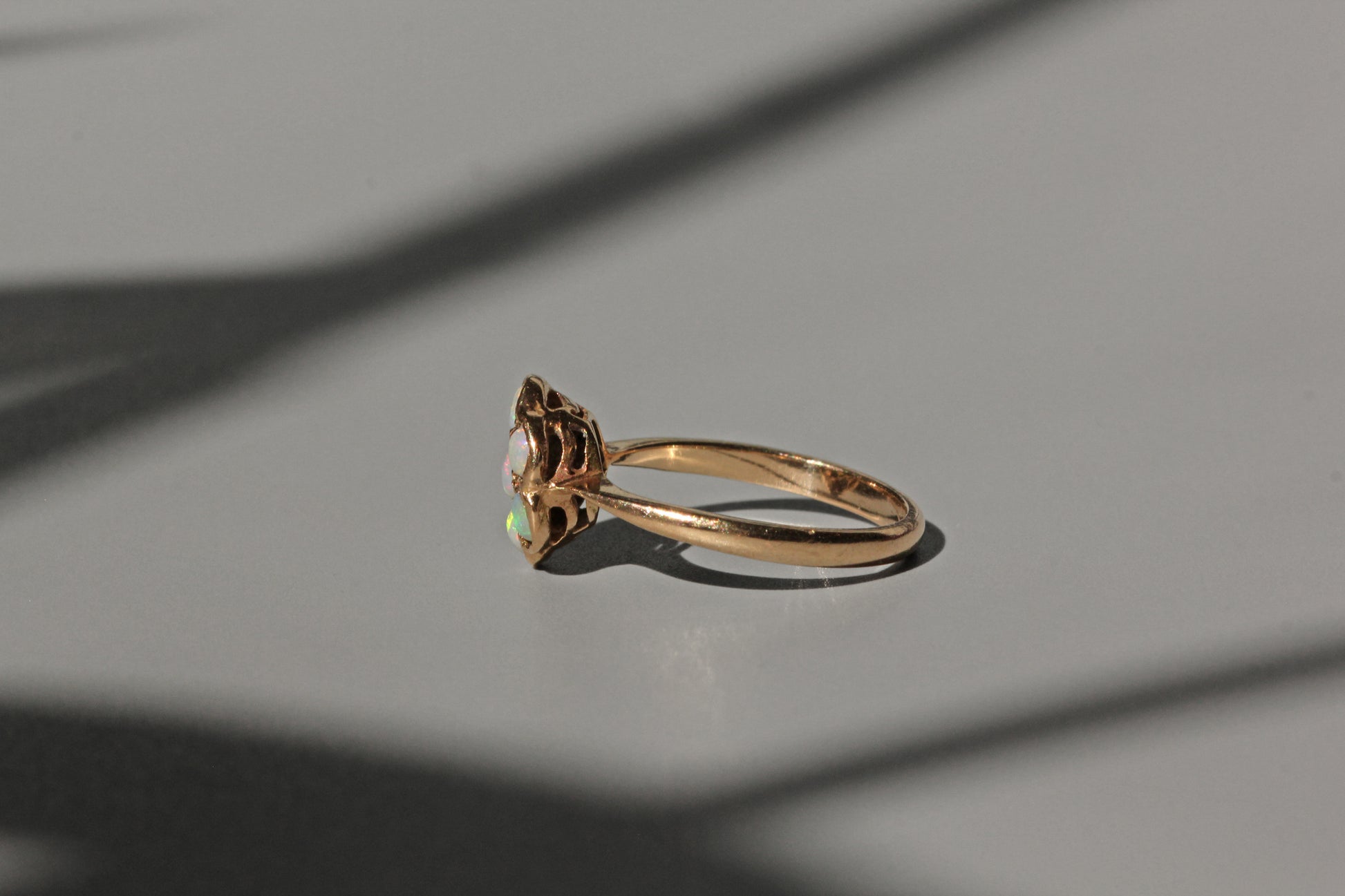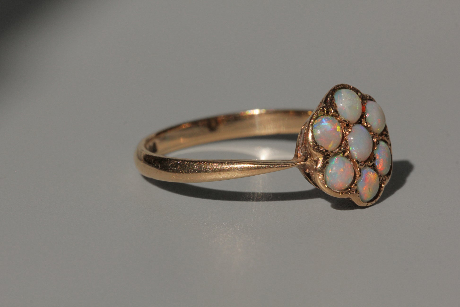 Lovely little piece, this ring hosts seven mystifying opals which harness a fiery kaleidoscope of colours. This stones are set in a flower formation, all well-matched in colour. Flanking the gallery are two tapered shoulders, accentuating the magical, feminine nature-inspired feel of this ring.