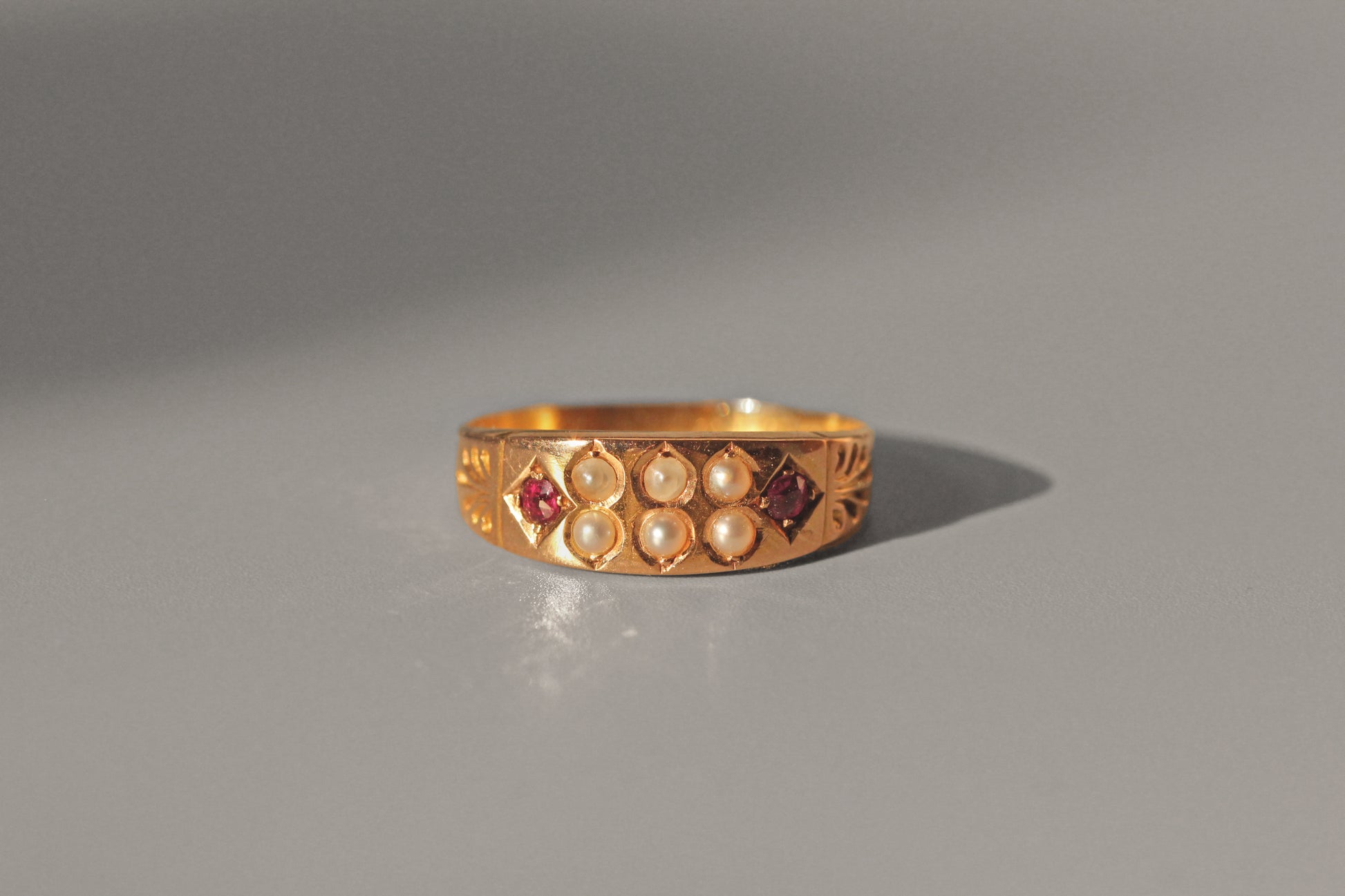 The ring features a flat, gently tapered band that leads into delicately etched shoulders, drawing the eye towards the ornate face of the ring. At its centre sits a harmonious arrangement of six seed pearls, admired for their soft cream tone and lovely natural lustre. These are flanked on either side by two hand cut rubies, vivid in colour and full of life.