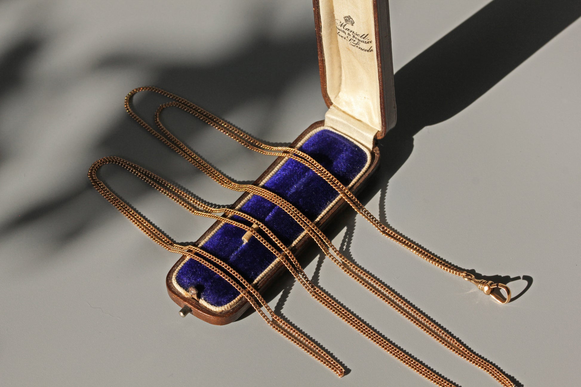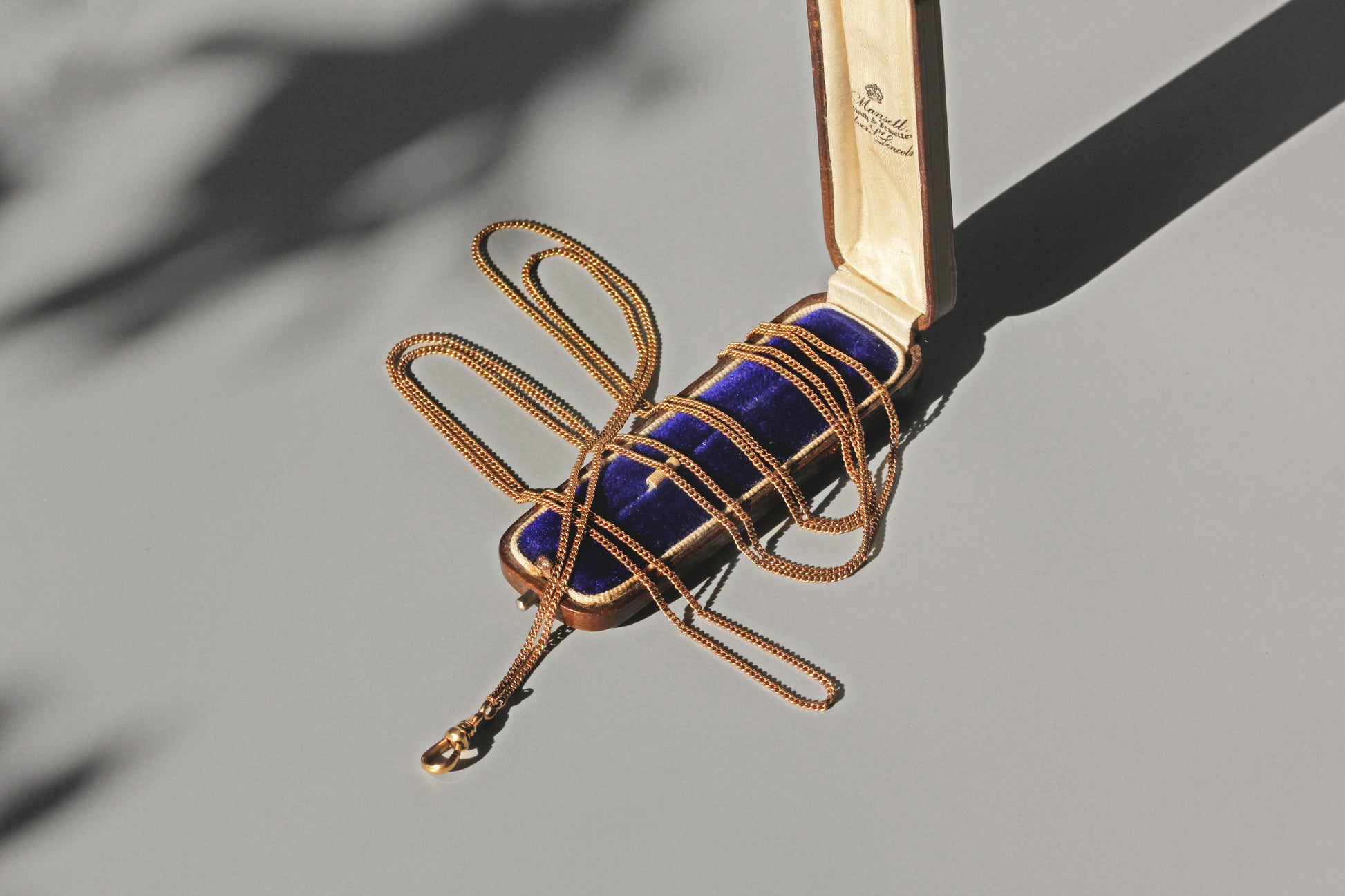 This lovely example of a muff chain is an absolute treasure. Crafted in warm 9 carat gold throughout, the chain is a gorgeous and sleek curb link which catches the sun beautifully. This piece looks absolutely stunning wrapped around the neck, with a charm or fob affixed, using the dog clip to clasp the piece to the end of the chain. This chain is incredibly versatile, thanks to its impressive length and the nature of the style, it can be worn in many different ways and lengths on the neck and wrist.