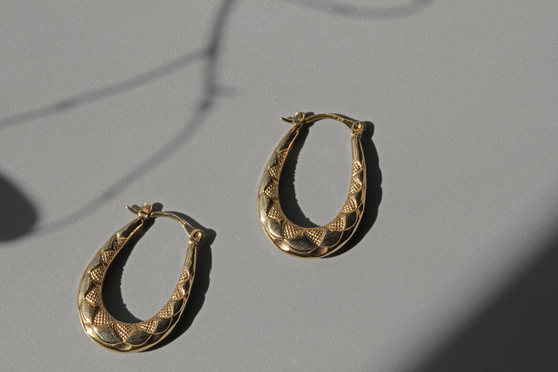 A classic staple, these gorgeous creole hoops have a fresh, elongated form to them with a textured petal like floral pattern and scalloped edge details. A super flattering shape and silhouette, these earrings look wonderful when worn.