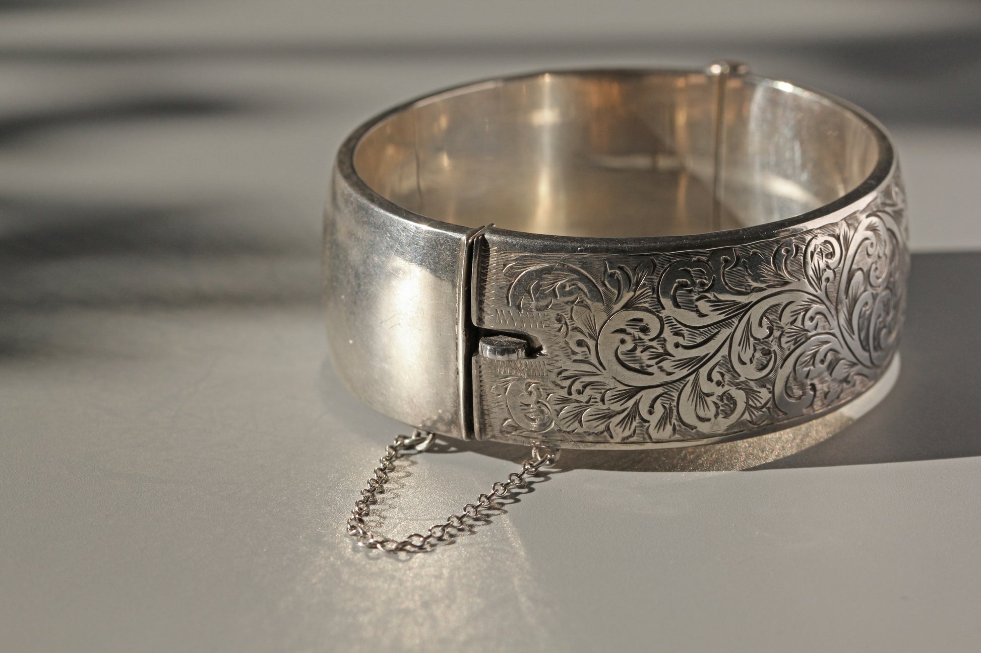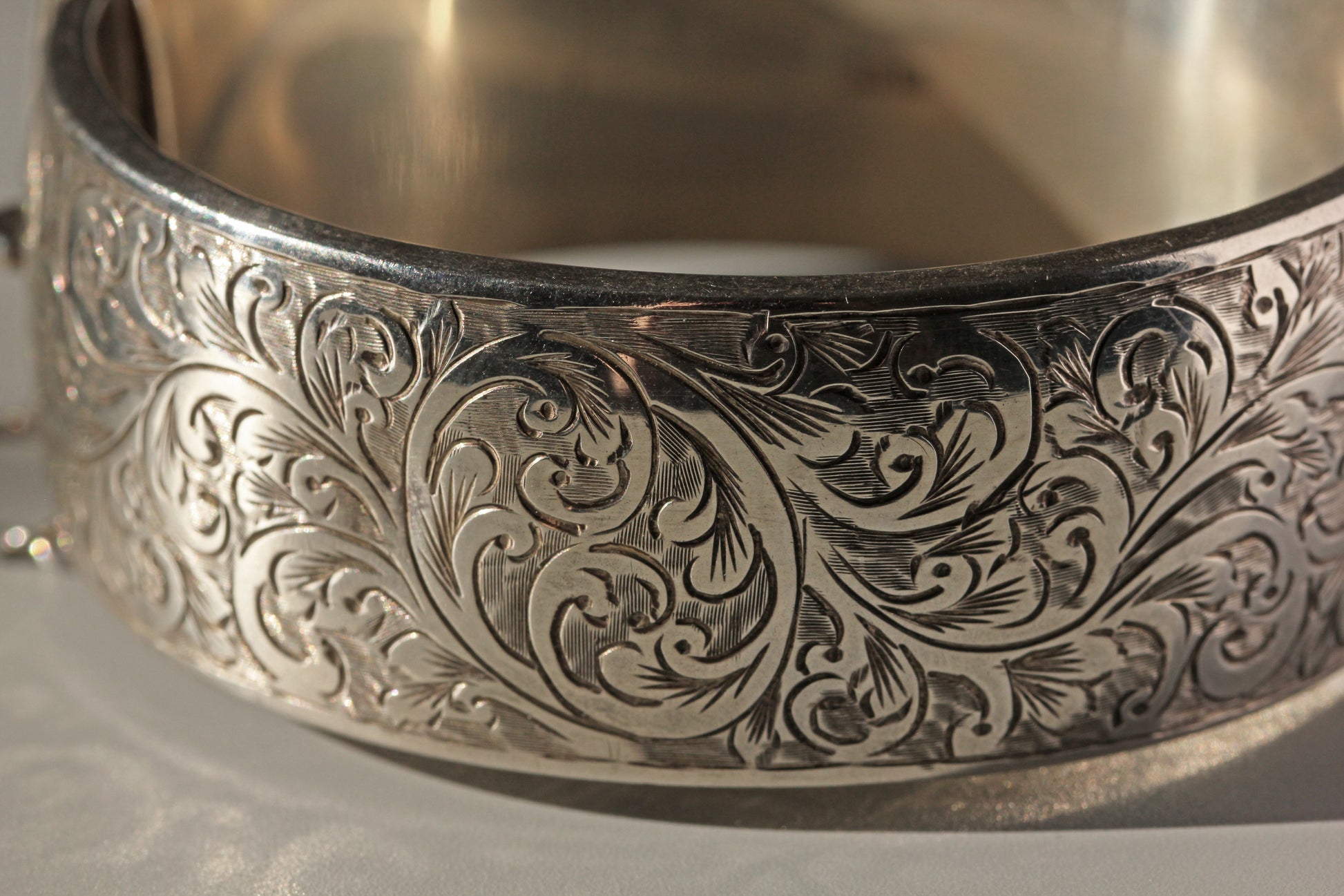 This thick, chunky cuff bangle or bracelet is decorated with a gorgeous etched scrolling foliate detail, covering the entire face of the piece. A fantastic size to it, this piece commands attention and has a bold presence on the wrist.