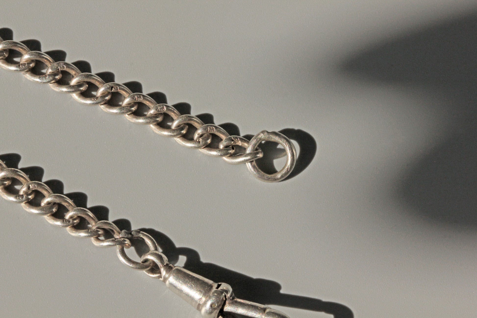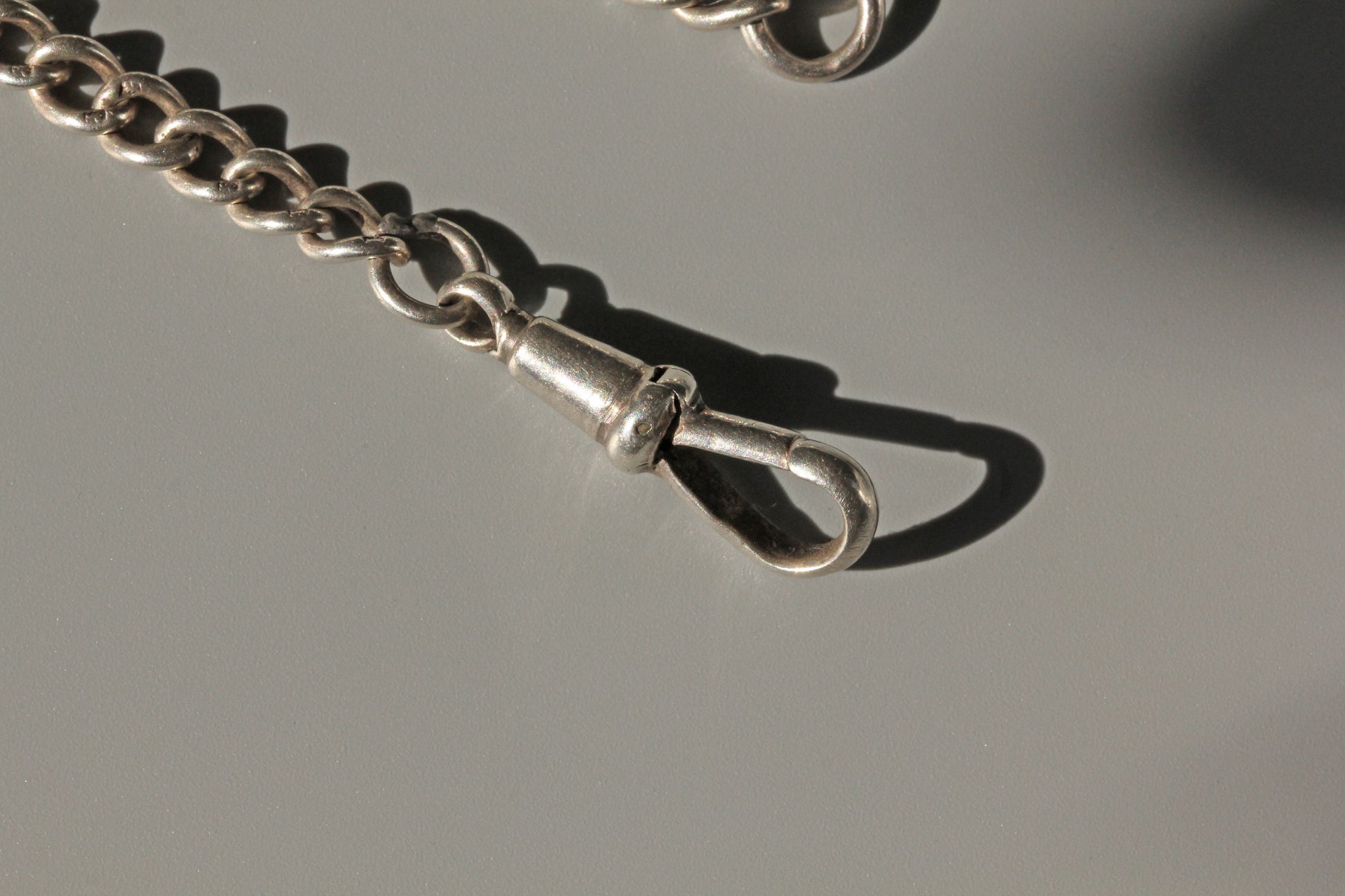 This piece is in great antique condition, signs of use and wear as expected with age. No major wear shown to the piece, few scratches here and there with natural antique patina/tarnish. Dog clip fastens securely.