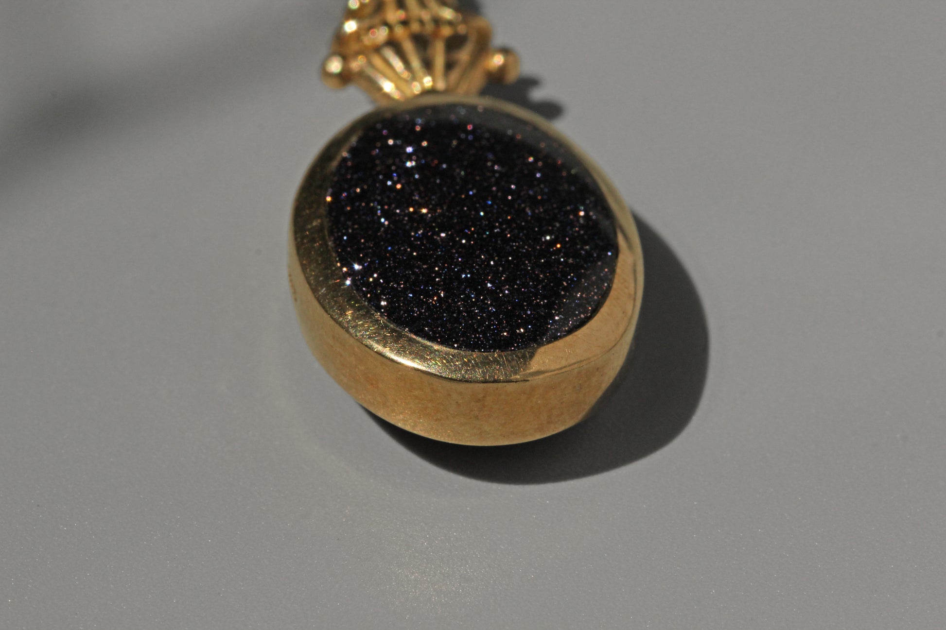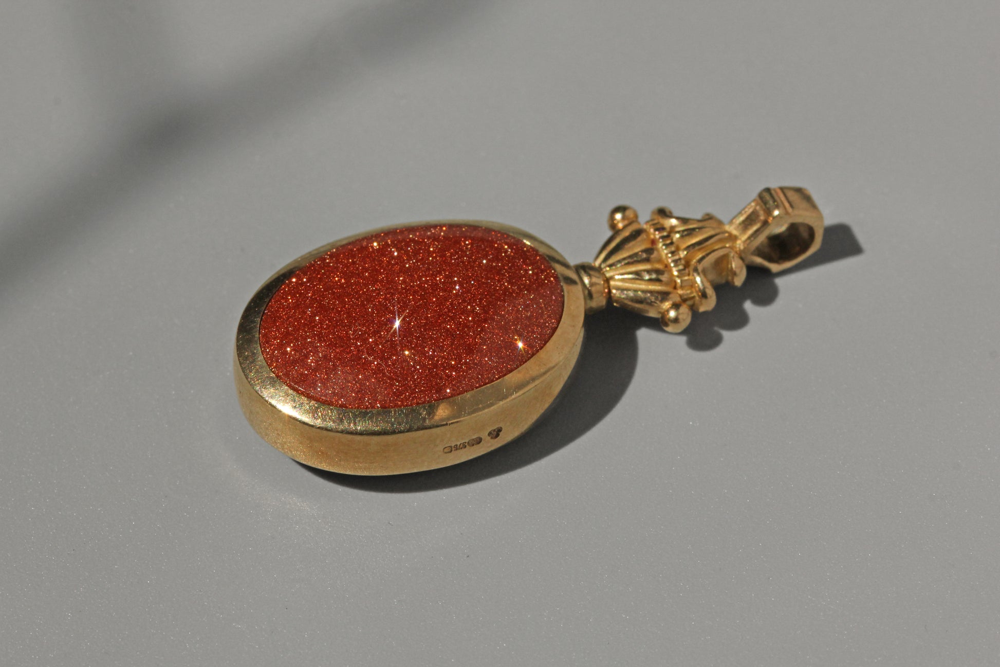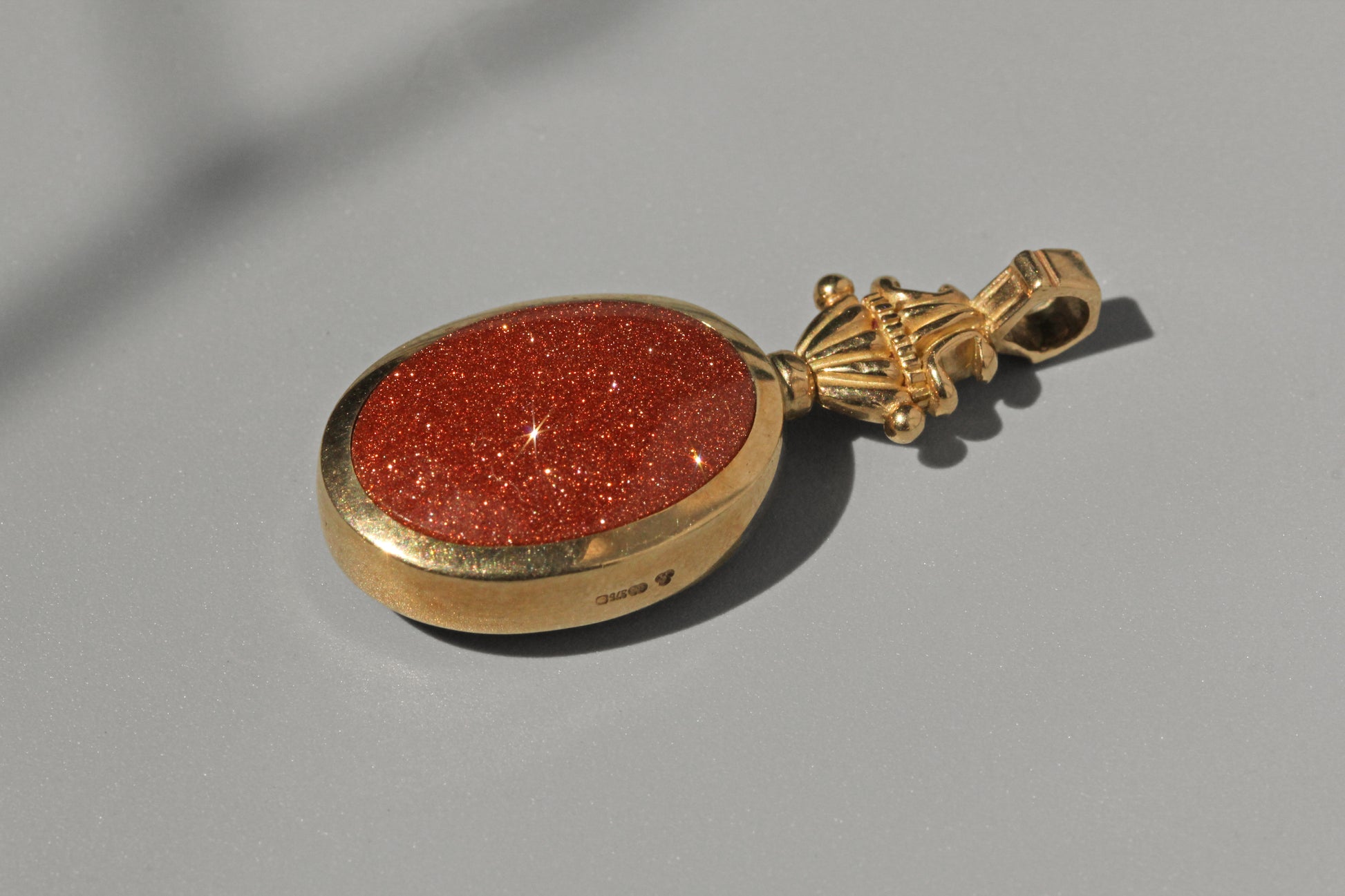 A classic piece, this lovely double sided fob hosts a sparkling terracotta goldstone cabochon, the other side a black goldstone/sunstone. Gorgeous polished frame, with the bail loop ornate and highly detailed. This piece looks wonderful when worn on a chain as a pendant.