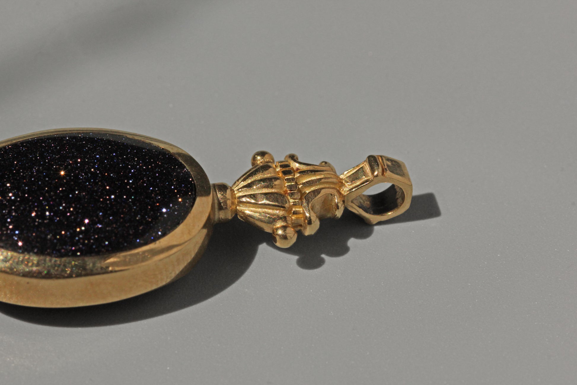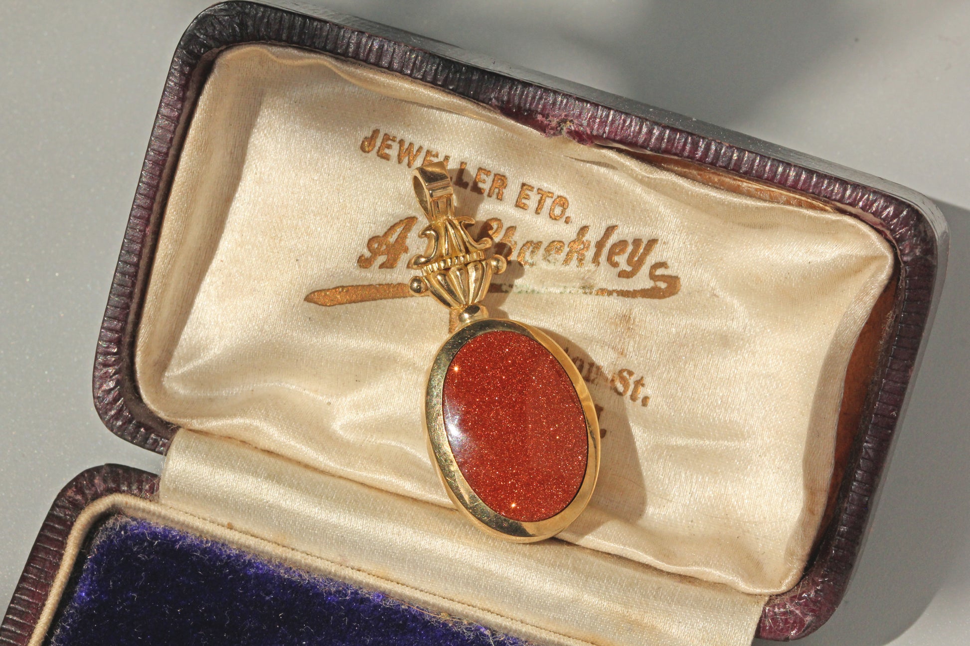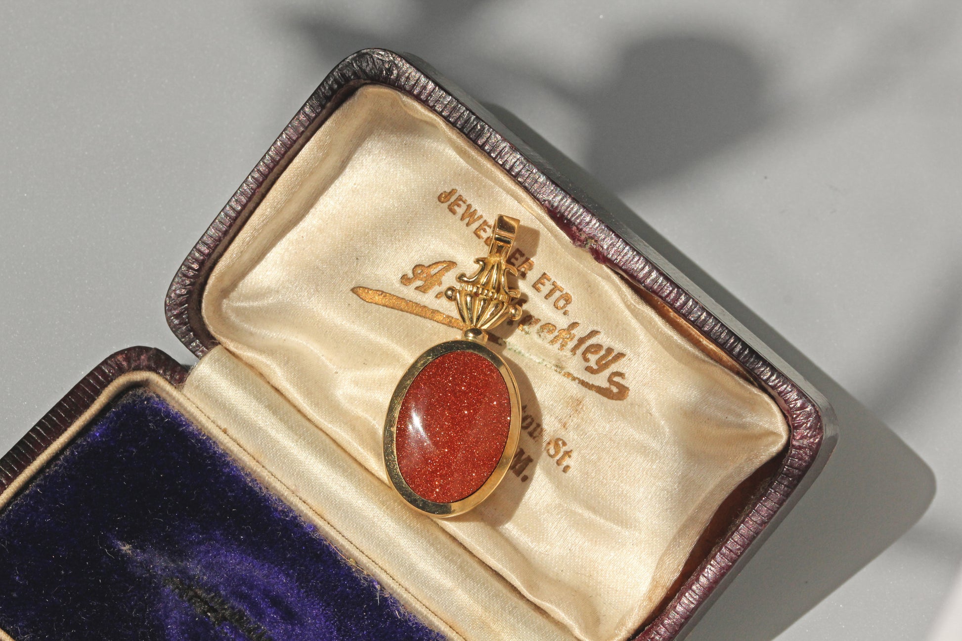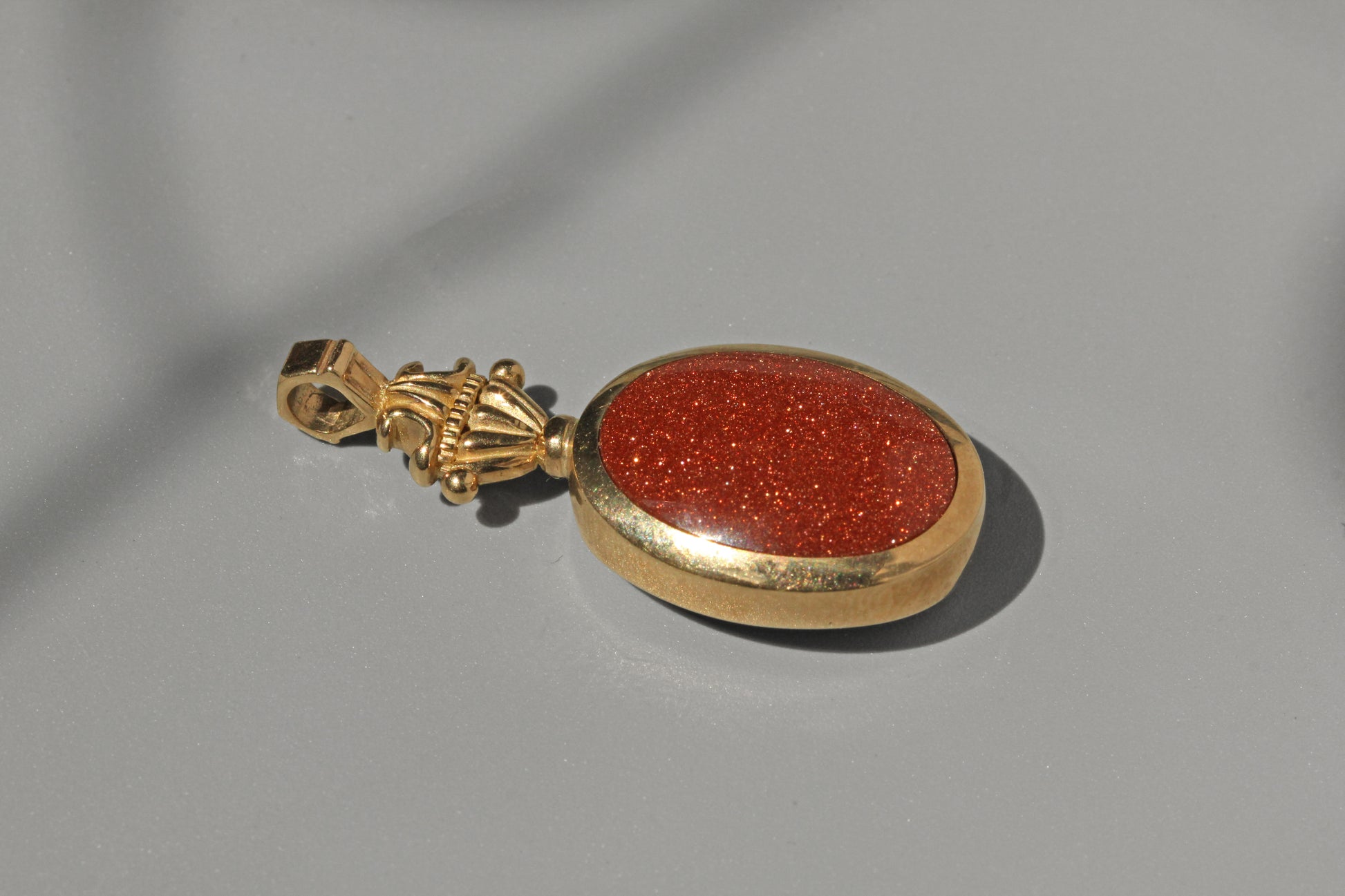 A classic piece, this lovely double sided fob hosts a sparkling terracotta goldstone cabochon, the other side a black goldstone/sunstone. Gorgeous polished frame, with the bail loop ornate and highly detailed. This piece looks wonderful when worn on a chain as a pendant.